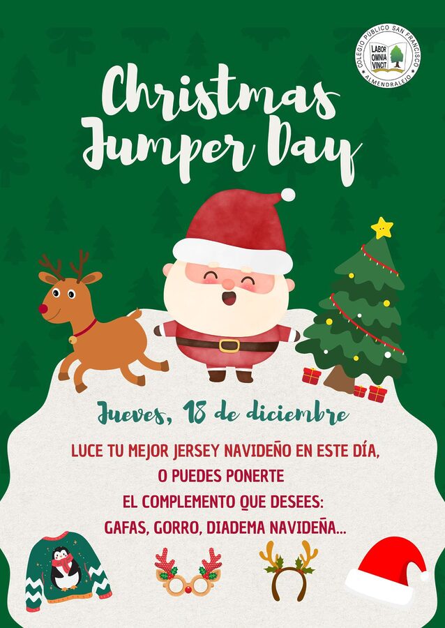 CHRISTMAS JUMPER DAY Escrito por Lourdes Rangel Merchán en 18 de diciembre de 2025. Publicado en Biblioteca, Noticias y Actividades. Adelántate a la Navidad y celebra su llegada poniéndote un jersey navideño, gorro, gafas o diadema para darle la bienvenida a estas fiestas.